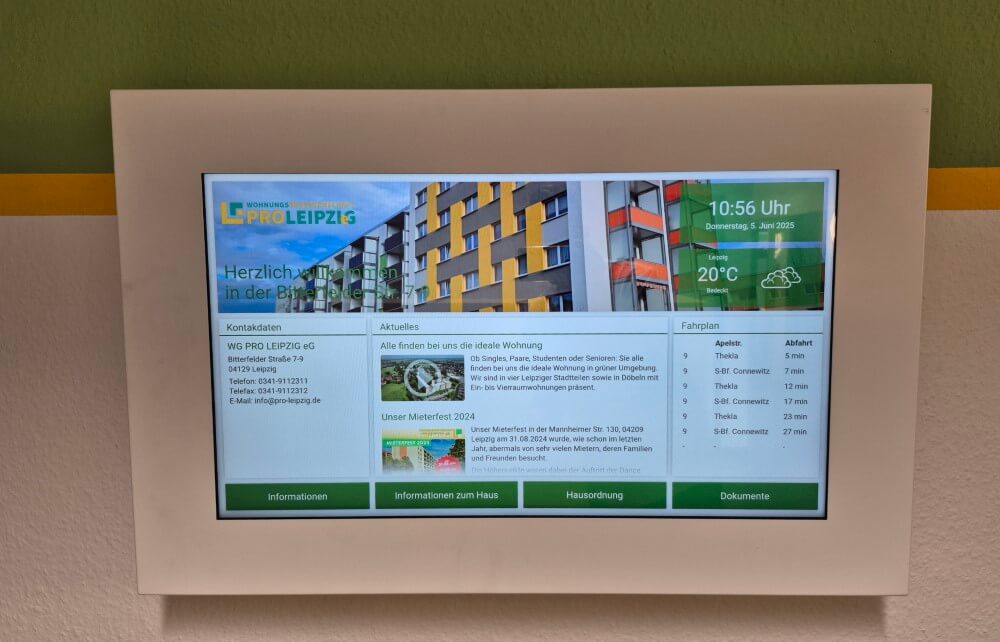 Im Mai 2025 startete unser Pilotprojekt mit insgesamt 15 digitalen Haustafeln in Zusammenarbeit mit der PŸUR Business. Diese wurden in verschiedenen Hauseingängen in Leipzig und Döbeln montiert. Hierüber erhalten alle unsere Mieter brandaktuelle Informationen das jeweilige Objekt betreffend. Insbesondere Infos zu Kontaktdaten unserer Ansprechpartner für verschiedene Anliegen, aktuelle Meldungen, aber auch darüber hinaus gehende Informationen, wie zum Beispiel aktuelle Fahrpläne des ÖPNV.