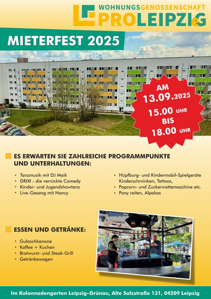 Unser jährliches, allseits beliebtes Mieterfest wird auch in diesem Jahr wie gewohnt im Kolonnadengarten in der Mannheimer Str. 130, 04209 Leipzig stattfinden. Der Termin hierfür ist der 13.09.2025 ab 15:00 Uhr. Wir freuen uns schon jetzt auf zahlreiche Teilnahme unserer Mieter, deren Familien und Freunde. Die Höhepunkte werden diesmal eine verrückte Comedy-Show und Live-Gesang mit Nancy Damm sein.